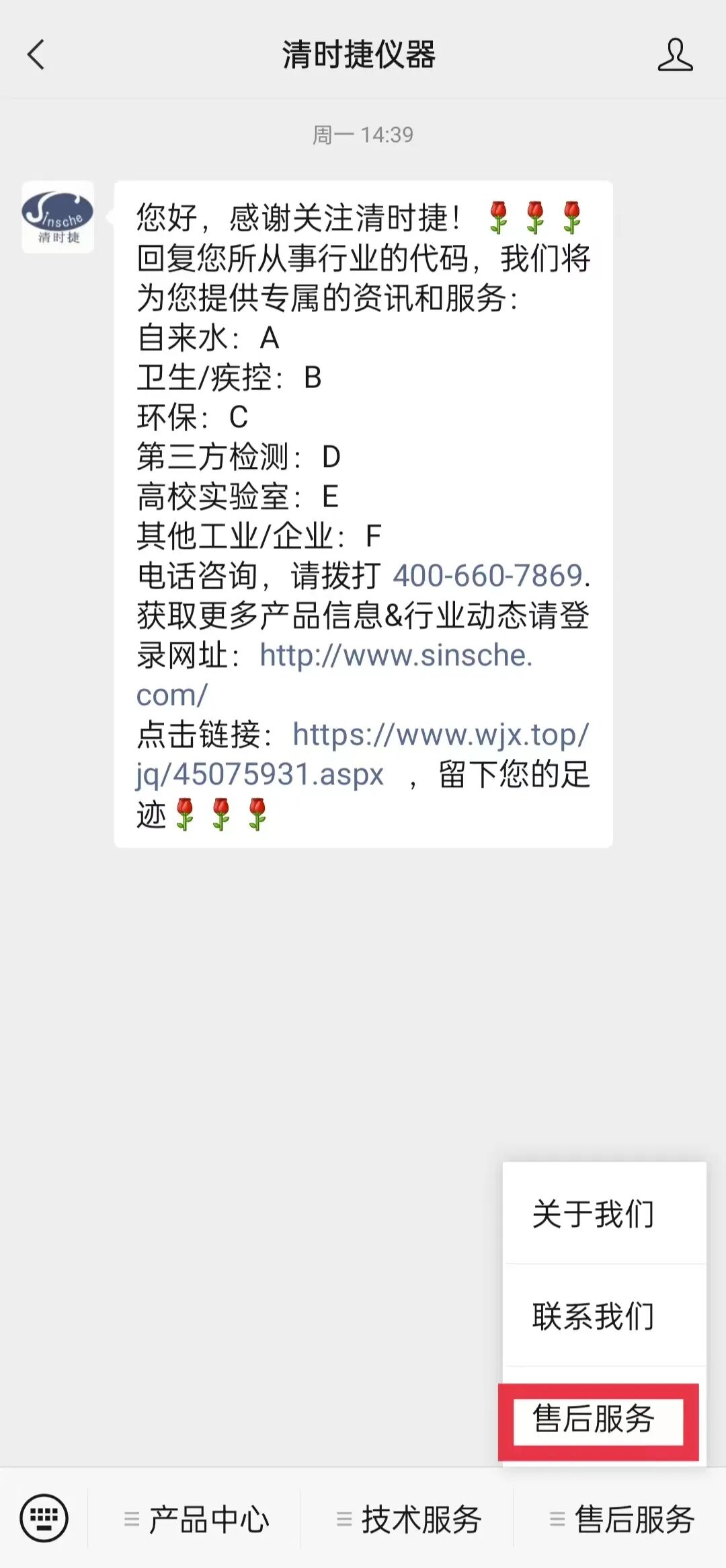 關(guān)注清時捷儀器公眾號,進(jìn)入聊天界面,點擊右下角售后服務(wù)即可進(jìn)入小程序,也可以直接搜索“清時捷售后服務(wù)”小程序。 售后報修 當(dāng)儀器出現(xiàn)故障時,就能通過“售后報修”板塊,填寫相關(guān)信息提交,后續(xù)會有專門人員及時聯(lián)系并處理問題。